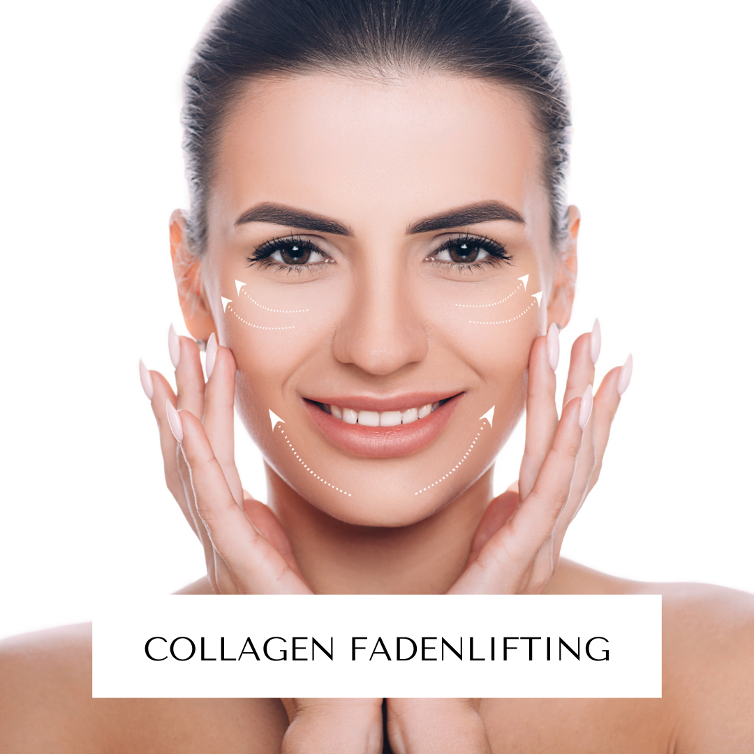 Kollagen-Fadenlifting ist eine hochwirksame, innovative Anti-Aging Behandlung welche ohne Nadeln auskommt. Dabei werden Gesichtsfalten gezielt mit Protein-Fäden aufgefüllt und sichtbar vermindert. Anschliessend wird ein Serum aufgetragen um Wirkstoffe freizusetzen, welche die hauteigene Kollagenproduktion anregen.