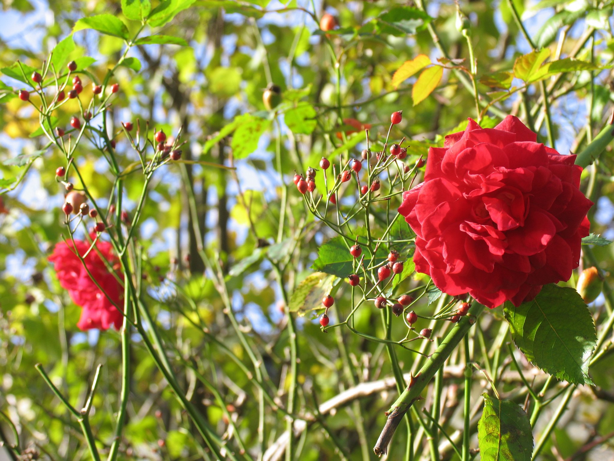 Eine eigentlich nur einmal blühende Rose legt nochmal nach. Die kleinen Hagebutten schickt die
